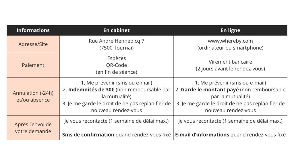 Je ne peux estimer à l’avance le temps que cela prendra avant un premier rendez-vous (les places en soirée sont particulièrement demandées et peuvent augmenter le délai du premier rendez-vous).